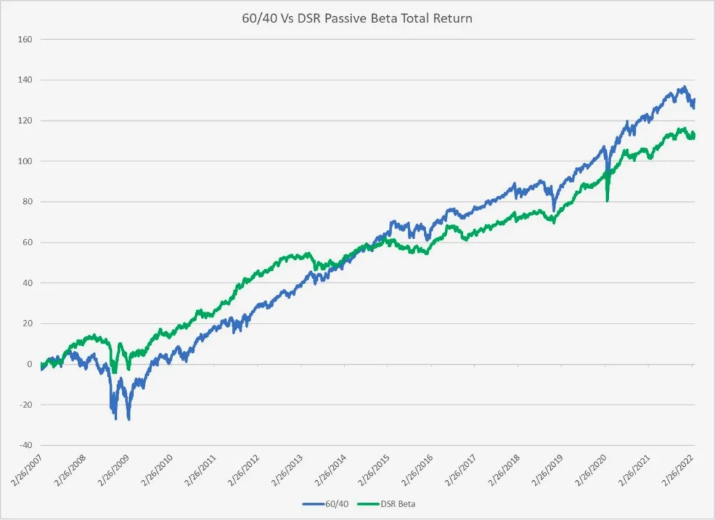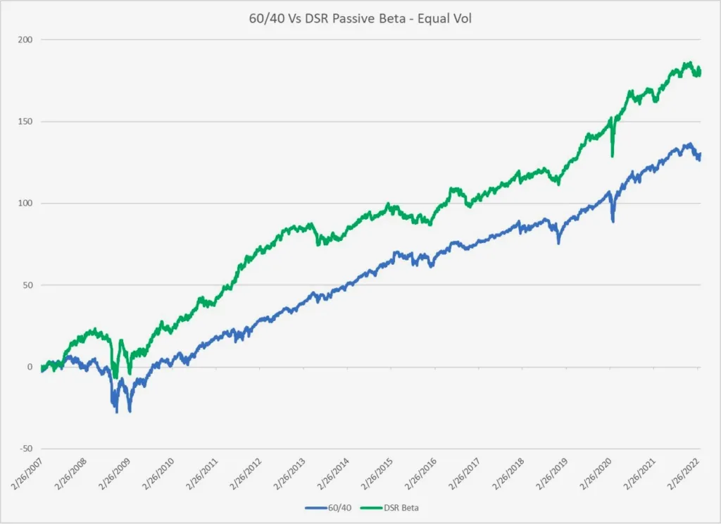 The realized Sharpe Ratio for the 60/40 portfolio was 0.50 over the last 15 years with a max drawdown of 34% While the DS Beta portfolio experienced a 0.68 Sharpe Ratio and only a 25% max drawdown. For that reason, one can leverage the DSR Beta portfolio. If one were to leverage to experience the same historic volatility in the DS Beta portfolio as the 60/40 portfolio the the DS Beta Would have outperformed by 160bp per year however with slightly worse peak to trough drawdowns which occurred when oil and other commodities crashed two years ago.
